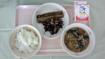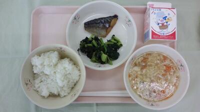 今日の給食は「ごはん、牛乳、さばの幽庵焼き、小松菜の炒め物、かきたま汁」です。