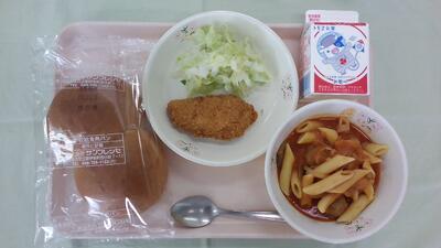 今日の給食は「はちみつパン、牛乳、ミートボールといんげん豆のペンネ、ほきのバジル揚げ、ボイルキャベツ」です。