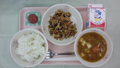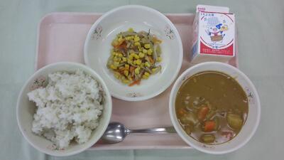 今日の給食は「サイコロカレー、牛乳、もやしとコーンのソテー」です。