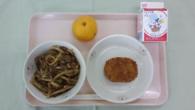 今日の給食は「ソース焼きうどん、牛乳、川口ポテトコロッケ、みかん」です。