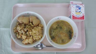 今日の給食は「キムチチャーハン、牛乳、いかナゲット、豆乳ごまスープ」です。