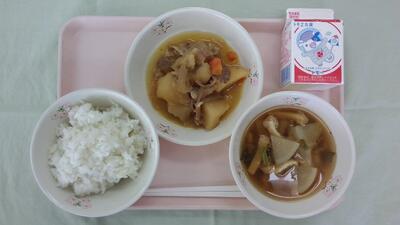 今日の給食は「ごはん、牛乳、肉じゃが、彩の国みそ汁」です。