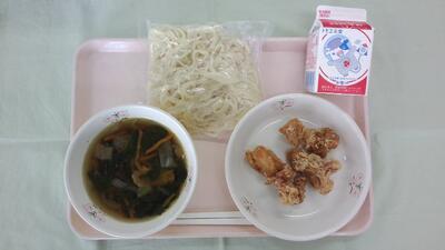 今日の給食は「五目ラーメン、牛乳、とりのから揚げ」です。