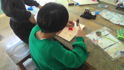 図工室から「トントン」と、かなづちでリズムよくくぎを打つ音が響いてきました。3年生、3学期の最初の図工の学習は、「トントンくぎ打ちコンコンビー玉」です。