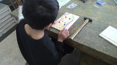 かなづちの使い方を動画や教師の手本で学んだあと、くぎをリズムよくトントンと打ち込んでいきます。初めて使うかなづちも楽しみながら、ビー玉が転がるコースを作っています。
