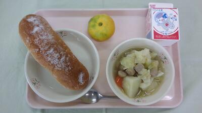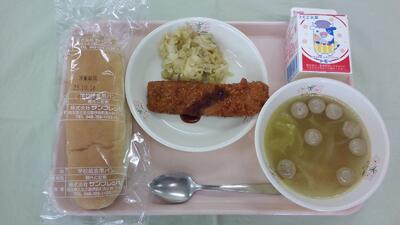 今日の給食は「コッペパン、牛乳、たちうおフライ、キャベツのソテー、ソーセージと白菜のスープ」です。