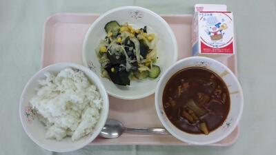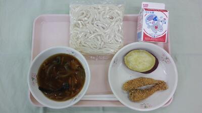 今日の給食は「カレーなんばん、牛乳、いわしフライ、ふかしいも」です。