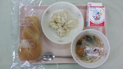 今日の給食は「ツイストパン、牛乳、さつまいものグラタン、ヌードルスープ」です。