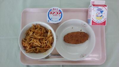 今日の給食は「スパゲティナポリタン、牛乳、コーンフライ、ヨーグルト」です。