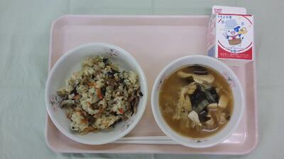 今日の給食は「豚肉と小松菜のごはん、牛乳、白菜のみそ汁」です。