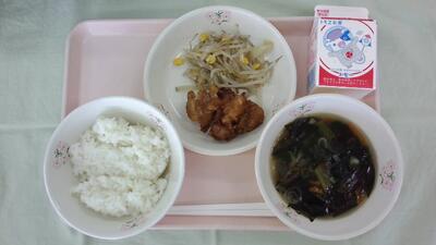 今日の給食は「ごはん、牛乳、ユーリンチー、もやしのソテー、わかめスープ」です。