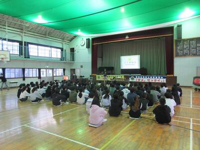 お話の中で薬物の危険性や勧誘を受けた時の断り方を実践も交えながら講義してもらいました。中学生になるにつれ人との交流も広がり薬物や飲酒、タバコなどの勧誘も増えてしまうかもしれません。お話にあった「知識・勇気・友達」を合言葉に正しい行動が出来るよう今日のお話を生かして欲しいです。