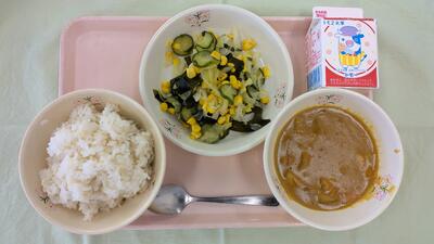 今日の給食は「チキンカレーライス、牛乳、新たまねぎドレッシングのサラダ」です。