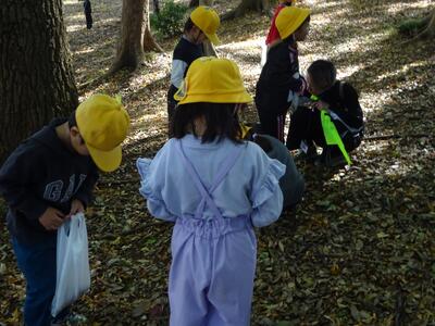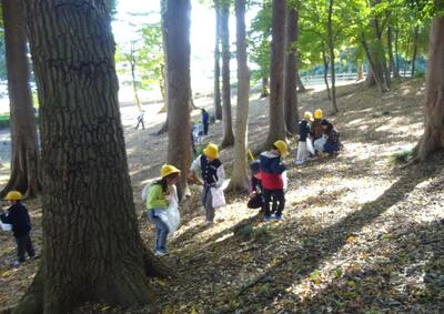 子供たちは、公園の様子を見て、「葉っぱの色が変わっている!」「どんぐりがいっぱい落ちている!」「帽子かぶっているどんぐりとか赤ちゃんどんぐりとか色々な種類があるよ!」など季節での違いをたくさん発見していました。
